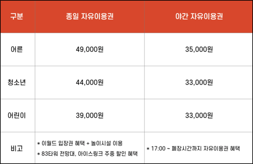 이월드 이용 요금은 종일 자유이용권, 야간 이용권, 연간회원권의 세 가지로 분류되어 있습니다.