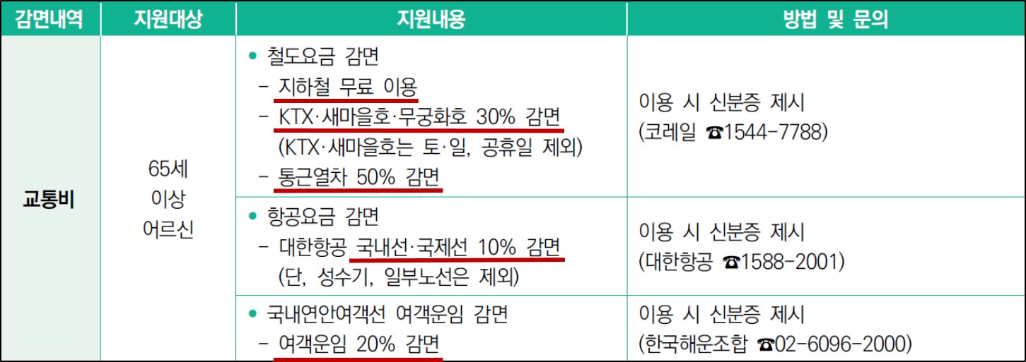 지하철 무료, KTX 새마을호는 30%, 통근 열차는 50%, 비행기는 10%, 배는 20% 감면받을 수 있습니다.