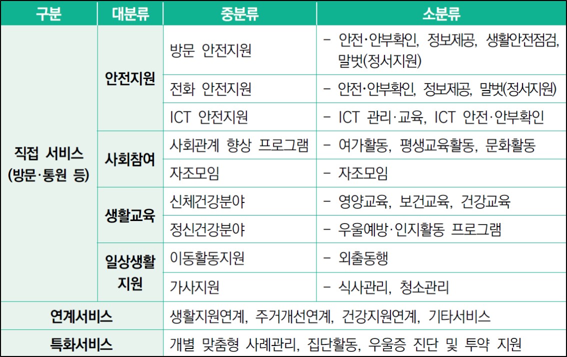 우울증 예방을 위한 프로그램과 외출 시 동행하는 서비스, 그리고 식사 관리나 청소 관리 등도 지원해 드립니다.