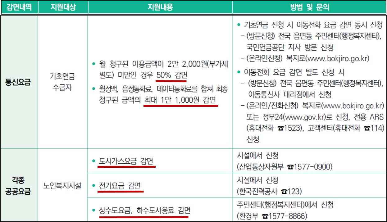 노인복지 혜택 중 교통비 감면, 건강보험 감면, 공공요금 감면, 통신요금 감면 등 일상생활에서 도움을 받을 수 있는 몇 가지의 혜택에 대한 간단한 내용들을 알아보았습니다. 독거노인을 위한 특별한 프로그램도 있으며, 이는 사회적 고립감을 줄여주고 생활의 질을 높이는 데 큰 도움이 될 것입니다.